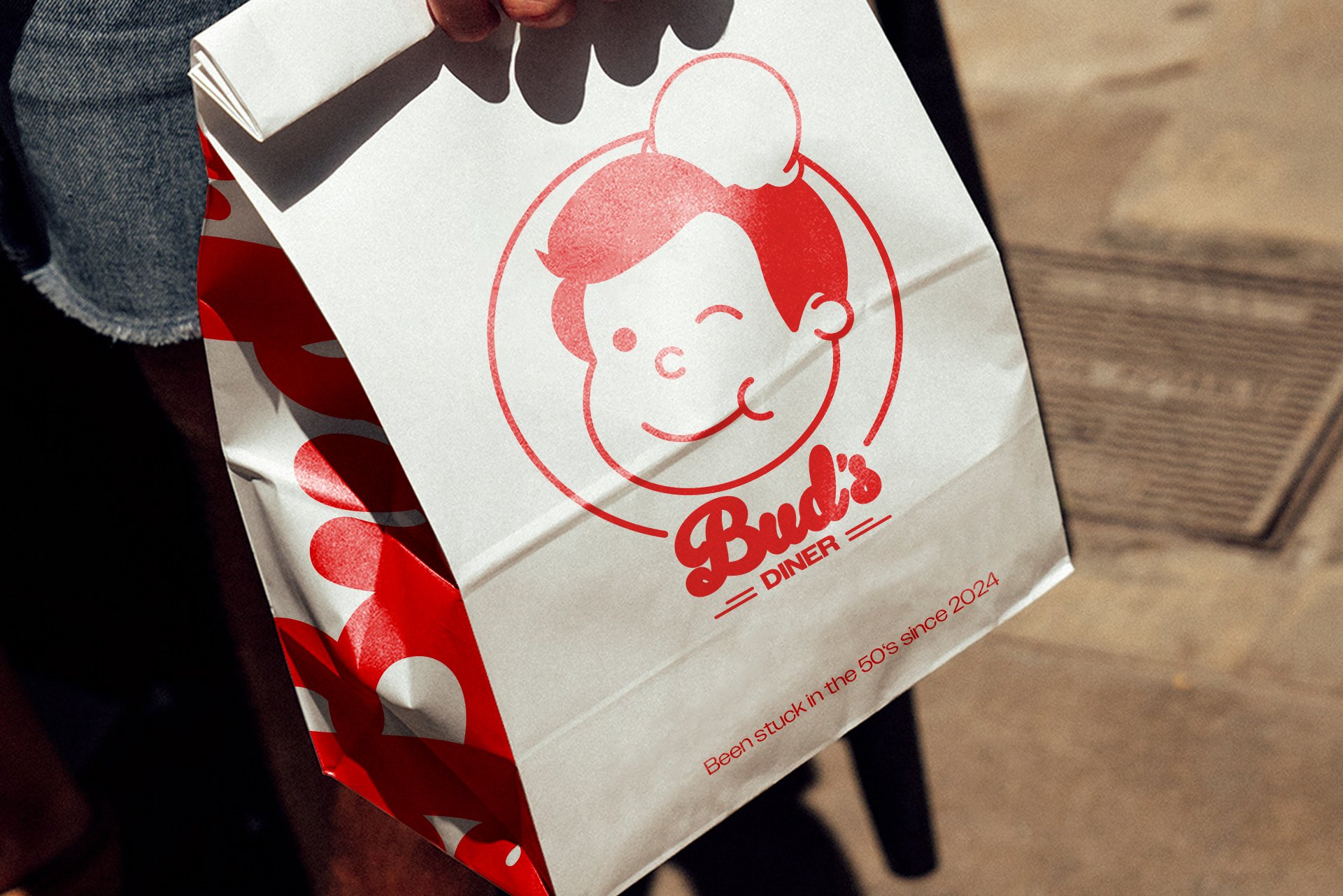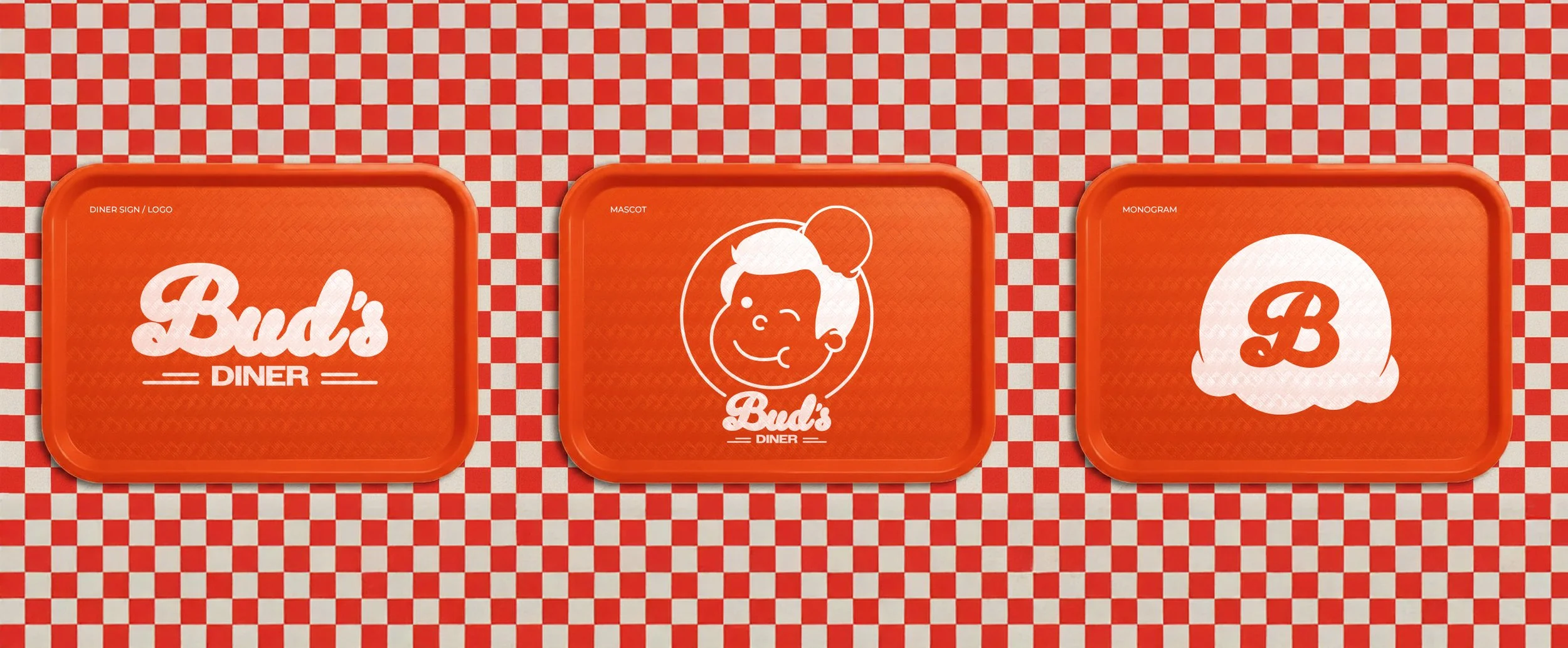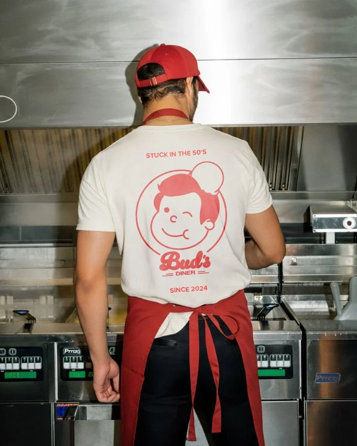 Supporting the logo is Bud, the friendly brand mascot. Inspired by the iconic mascots of mid-century America. Bud will grace everything from burger wrappers to drinks and merchandise, creating a welcoming and familiar presence. The Bud's Diner monogram, inspired by the diner’s famous ice cream floats is used sparingly on social media and advertisements, further strengthening the brand identity.